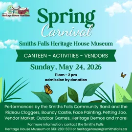 Join the Smiths Falls Heritage House on Sunday, May 24, from 11:00 am to 2:00 pm, for Spring Carnival! Spend some time outdoors in the warmer weather and celebrate the season with family friendly activities, games, entertainment, and a vendor market.